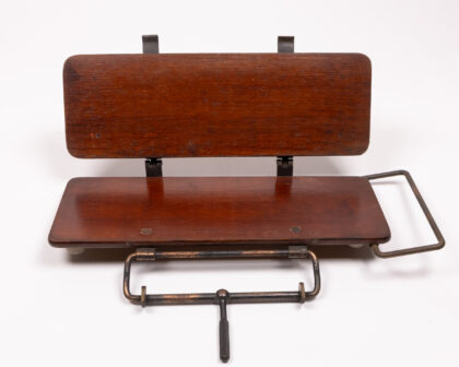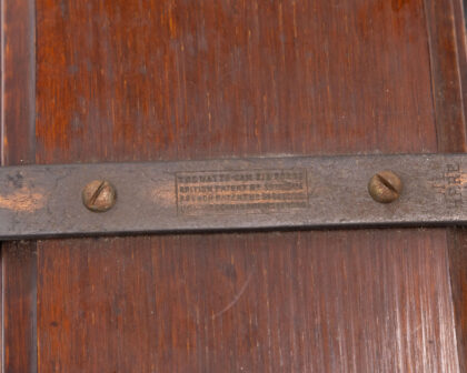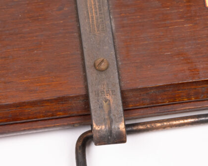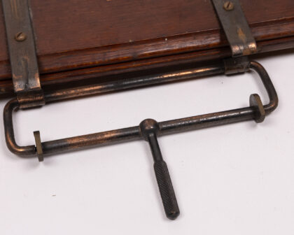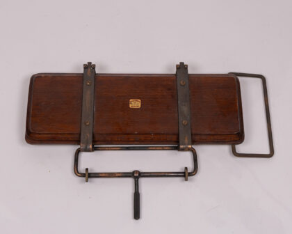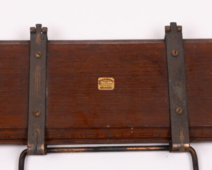 A rare and historically significant Vintage Kyle & Cheyne Belfast Patented Tie Press, crafted by the renowned Naval & Military Outfitters. This robust tool, constructed from durable metal and rich wood, showcases exceptional early 20th-century engineering, holding British, French, USA, and German patents pending. Designed for precision and utility, it serves as a unique piece of industrial and military heritage. The piece exhibits visible wear commensurate with its age, including minor scratches on the wood and slight rust on the metal parts, which contribute to its authentic vintage character. Ideal for collectors of military memorabilia, unique vintage tools, or those seeking a distinctive decorative object for a home office or man cave.
