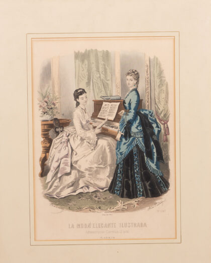This is a vintage framed print featuring two stylishly dressed women with the title 'La Moda Elegante Illustrada' and the inscription 'Madrid, 1867'. The print showcases the fashion of the era. The frame is gold-toned, and there is some age wear to the print and frame. Overall, this piece adds a touch of vintage elegance and would be a great addition to any collection or décor.
