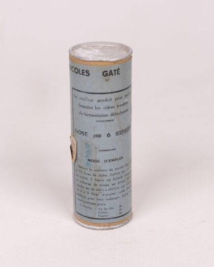 This is a vintage Le Clarifiant Gate powder container. The container is made of a cardboard-like material with metal top and bottom. It has a blue and silver colouring, with the text written in black. The text is in French. It has the company name, logo and address written on it. It has instructions for the use of the product on the rear of the container. The container is in good condition for its age. There are some marks and scratches to the metal and the cardboard has some marks and fading in places. The container is from Granville 1915.