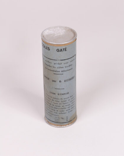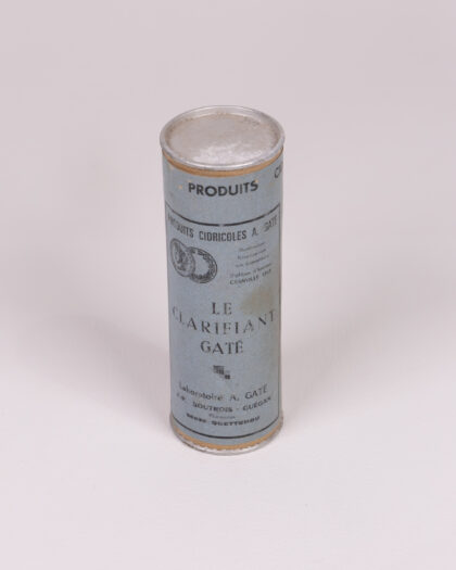 This is a vintage metal container for 'Le Clarifiant Gate' product, likely a cider clarifying agent. The container is cylindrical with a seamed metal body and lid. The label is light blue with black lettering. The label provides product details and instructions in French. The can shows some signs of age and wear including some rusting and minor dents, but overall is in good condition for its age. A unique piece for collectors of vintage petroliana or advertising.