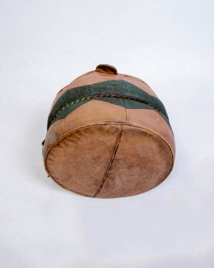 Vintage leather footstool featuring patchwork design and green fabric band. Good condition with some wear to the leather.
