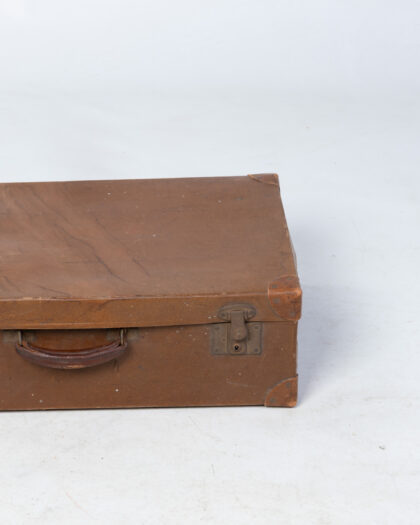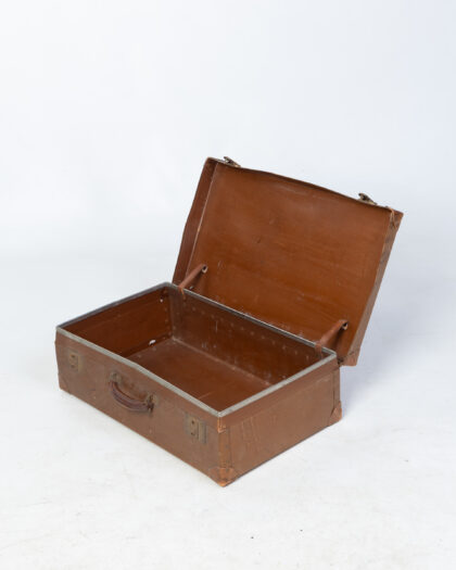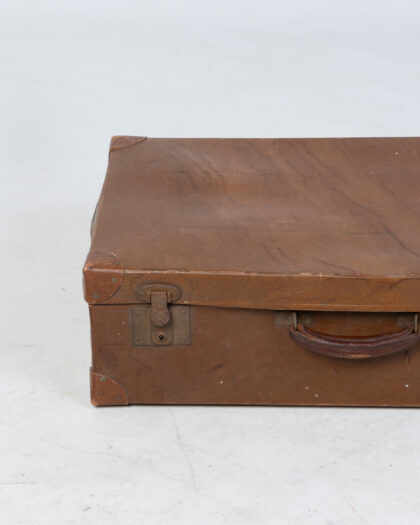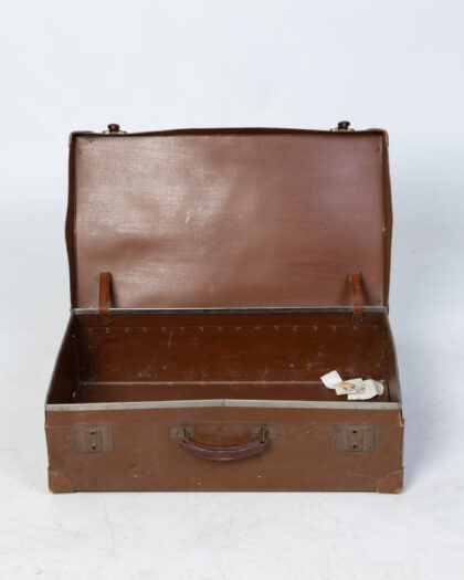 A handsome vintage suitcase, constructed from brown leather with metal hardware. The suitcase shows signs of age and wear, consistent with its history. Some scuffs and marks are present on the leather. This suitcase would make a great decorative piece or a unique storage container. Please see images for details of condition.