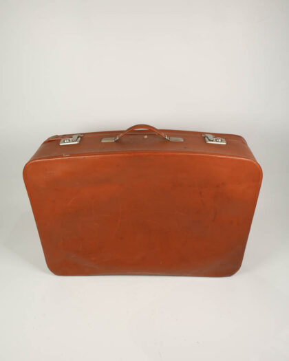 This is a vintage brown leather suitcase. The exterior is made of brown leather and features metal latches and a leather handle. The initials E.HH.K. are on the side. The interior is lined with a brown fabric. The exterior has some marks and scratches. The interior fabric is worn and shows some signs of age. This vintage suitcase would look great as a decorative piece in a bedroom or living room.