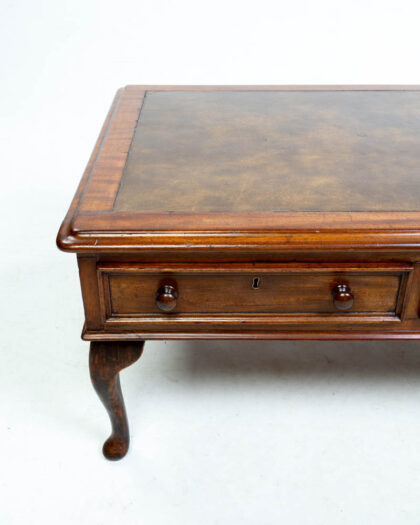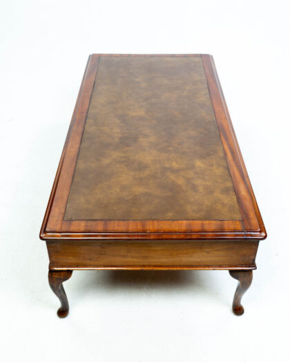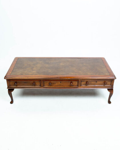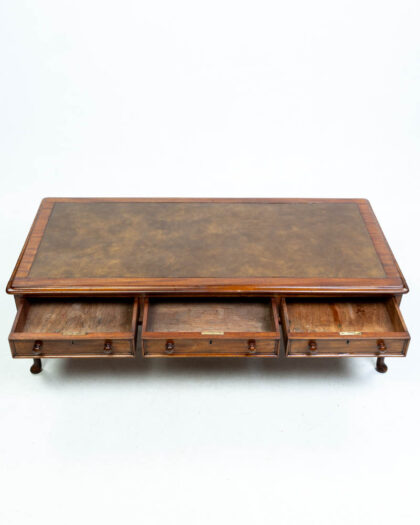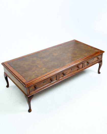 Vintage coffee table with brown leather top, wooden frame, and three drawers with brass pulls. Elegant cabriole legs. Good condition.