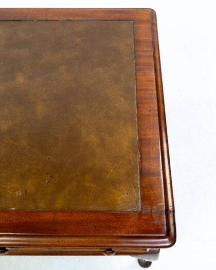 The leather top has a smooth, worn texture and a mottled dark green and brown colour. The brass drawer pulls add a touch of elegance to the piece.