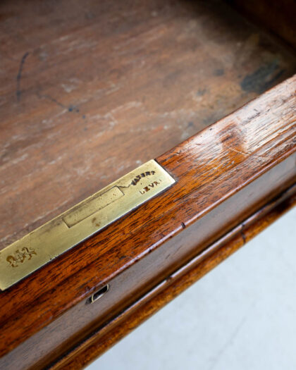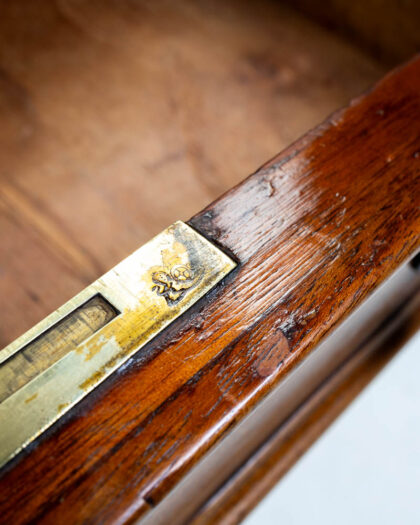 The wooden frame is a rich brown colour. The drawers are lined with wood. A brass label can be seen inside the drawer.