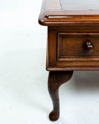This is a vintage coffee table featuring a brown leather top and a wooden frame. The table has three drawers, each with a brass pull. The drawers are functional and provide storage space. The table stands on elegant cabriole legs. The leather top shows some wear, adding to the vintage appeal.