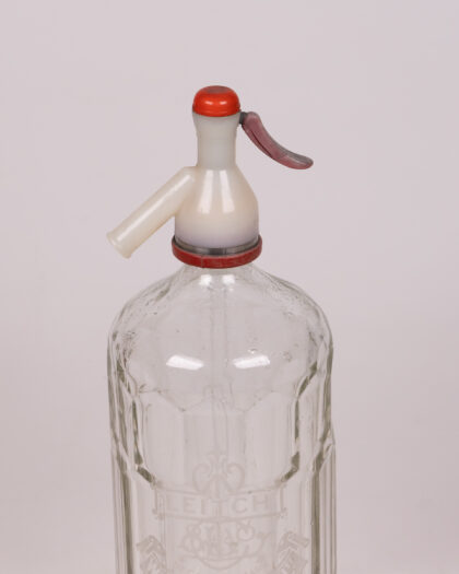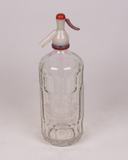 Vintage Leitch Fitch & Co Edinburgh glass soda siphon with red plastic top. Some wear consistent with age. Display or use in retro home bar.
