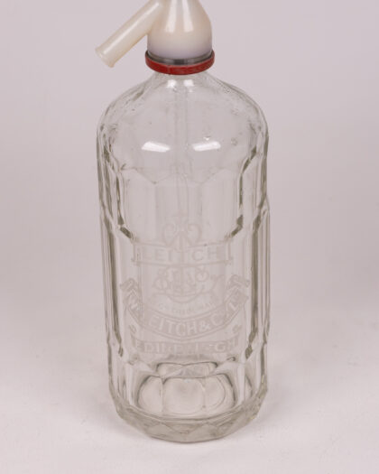 This is a vintage Leitch Fitch & Co Edinburgh glass soda siphon. The bottle itself is clear glass with a geometric paneled design. The company name and location (Edinburgh) are embossed on the glass in an elegant font. The siphon mechanism is made of a white plastic material, with a red top and lever. This vintage soda siphon is a unique and interesting piece, perfect for display or use in a vintage-themed home bar. There are some signs of wear and age, including minor scuffs and marks on the glass and plastic components.