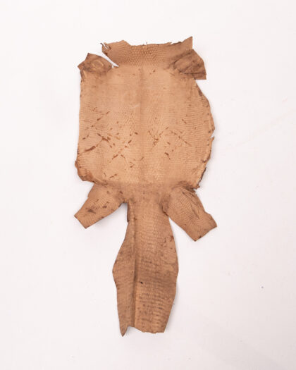 This is a tanned lizard skin. The skin has a brown hue, with the natural pattern of the lizard scales being visible. The skin appears to be supple and well-preserved. It could be used for crafting, display, or other decorative purposes. The skin shows some marks due to the nature of the item.