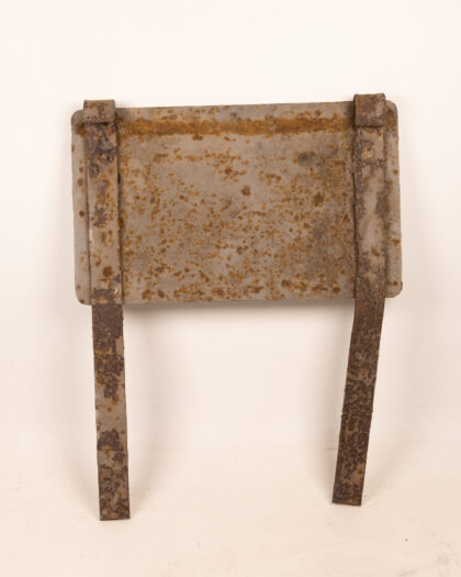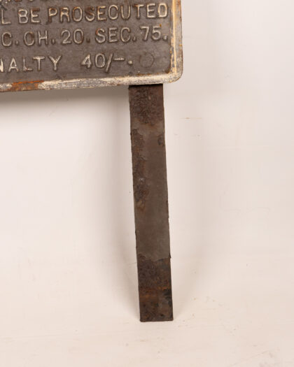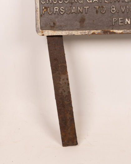 Original vintage LMS NCC railway crossing sign. Made of cast iron with raised lettering. Reads "L.M.S. N.C.C. NOTICE RELATIVE TO ACCOMMODATION CROSSING GATES. ANY PERSON OMITTING TO SHUT AND FASTEN THIS ACCOMMODATION CROSSING GATE WILL BE PROSECUTED PURSUANT TO 8. VIC. CH. 20. SEC. 75. PENALTY 40/-.". The sign shows considerable rusting and wear consistent with age and outdoor use. The back of the sign is also rusted. Legs attached to the sign for standing. Perfect for railway enthusiasts or vintage sign collectors.