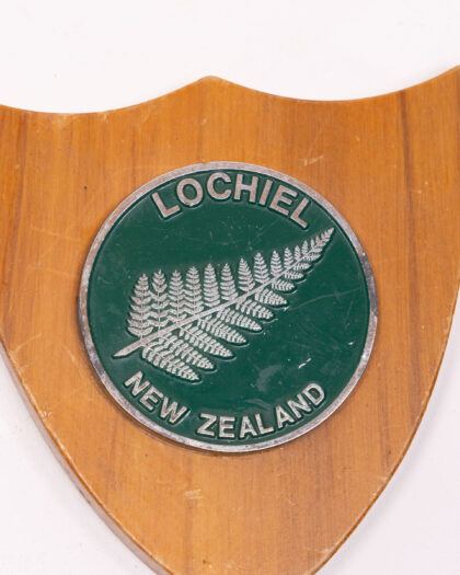 Vintage Lochiel New Zealand wooden wall plaque with metal fern emblem and unique historical details on reverse. A distinctive piece for collectors or home decor.