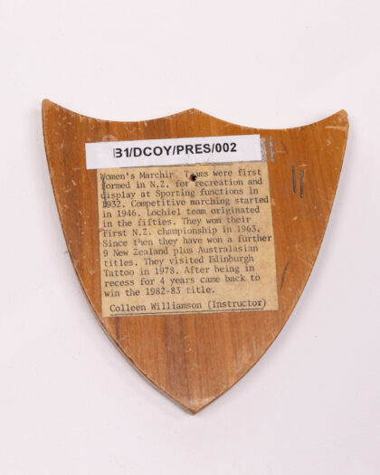 Discover a unique piece of New Zealand history with this vintage Lochiel wall plaque. Crafted from shield-shaped wood, it features a striking green and silver metal emblem proudly displaying a silver fern and the words 'Lochiel New Zealand'. The reverse side holds a fascinating paper sticker detailing the history of the renowned Lochiel women's marching team, including their formation in 1932, competitive start in 1946, their first New Zealand championship in 1963, and subsequent titles, including a visit to the Edinburgh Tattoo in 1978 and a 1982-83 championship win. This authentic vintage item exhibits charming signs of its age, including minor wear and tear, some tarnishing on the metal, and slight imperfections, all contributing to its unique character. Perfect for collectors of New Zealand memorabilia, vintage sports history enthusiasts, or as a distinctive decorative accent for a home office or living space.