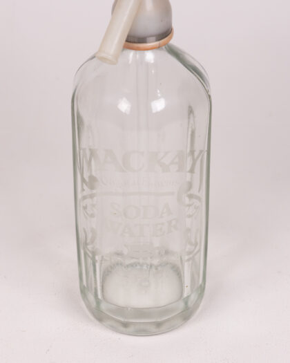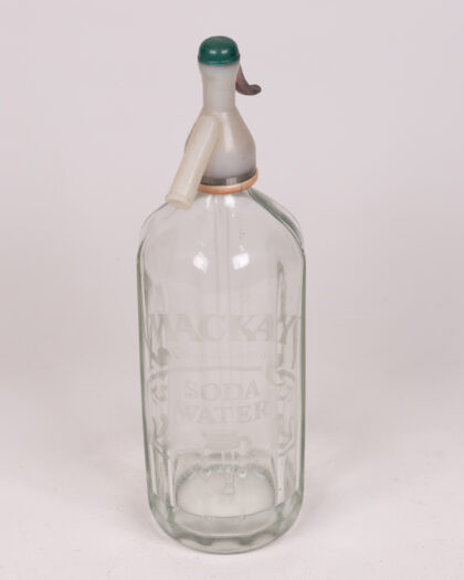 This is a vintage glass soda siphon bottle, marked 'Mackay Original drawings SODA WATER' on the front. The glass is clear, allowing the contents to be seen. The top is made of plastic or similar material, with a green cap. The lever is silver. This item would be a good decor piece. Good used condition, some wear consistent with age.