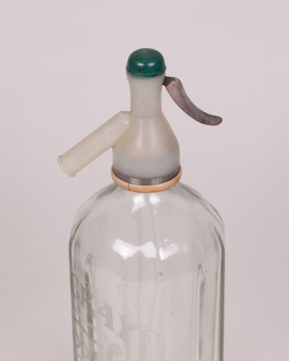 Vintage 'Mackay' glass soda siphon bottle with green top. Retro barware or kitchenalia decor piece. Good used condition.
