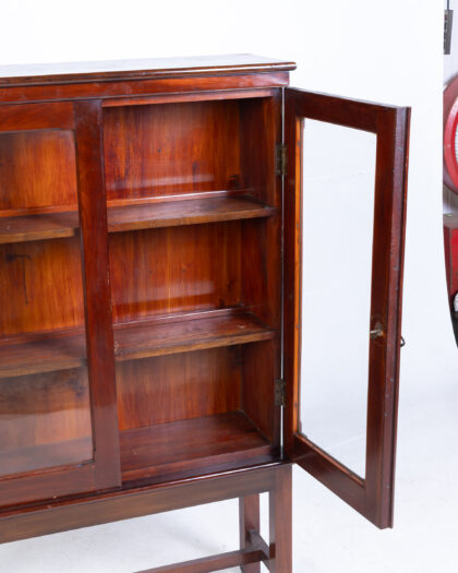 This mahogany display cabinet features two glass doors. Inside, three shelves offer ample storage and display space. The cabinet sits atop a sturdy, straight-legged stand with a crossbar for added stability. The wood has a rich, dark finish that highlights the mahogany grain. The glass doors allow for clear viewing of the cabinet's contents, making it ideal for showcasing collectibles or treasured items. The piece shows signs of age, adding to its antique charm. The cabinet is in good condition, showcasing the beautiful craftsmanship and design of the era.