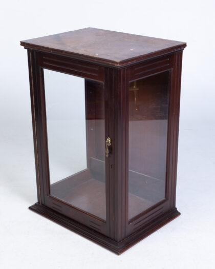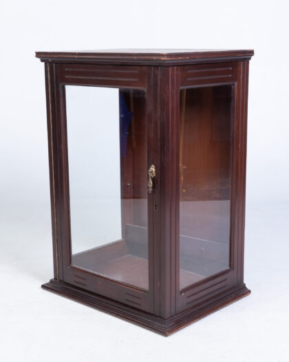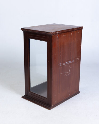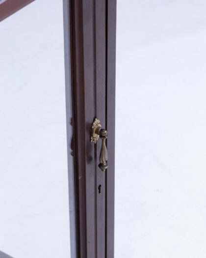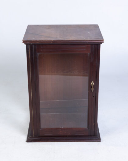 Vintage mahogany display cabinet with glazed door, brass handle, and decorative molding. Perfect for displaying collectibles.