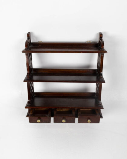 This is a vintage mahogany hanging wall shelf featuring three small drawers. The dark brown wood has a rich sheen and is nicely polished. The shelf has an open design, with two shelves above the drawer section. The drawers each have a small brass knob. The sides have open fretwork. The shelf is in very good vintage condition with only minor signs of wear. It is ready to be hung and used to display small items in a living room, bedroom, or bathroom.