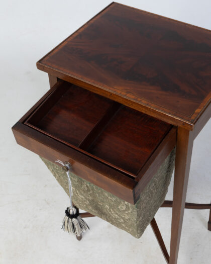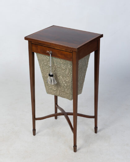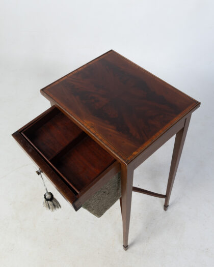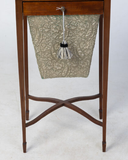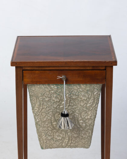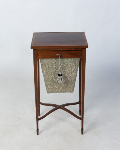This is a vintage sewing table, crafted from a dark-stained wood, possibly walnut or mahogany. The table features a rectangular top with an inlaid border and a single drawer with a small pull. Below the drawer is a fabric bag, likely for storing sewing supplies, adorned with an ornate pattern. The table is supported by four straight legs connected by an 'X' shaped stretcher. The fabric bag hangs freely and is finished with a decorative tassel. There are signs of age and wear, adding to its vintage charm, making it a functional and decorative piece of furniture.