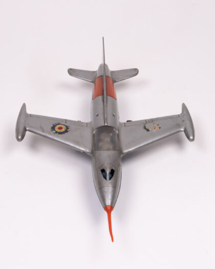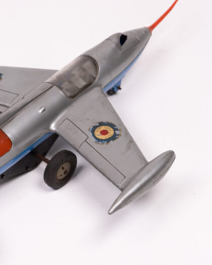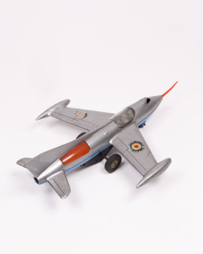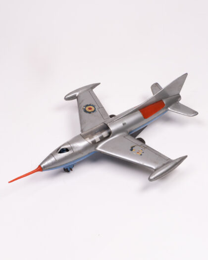 Vintage toy aeroplane, metal construction with a red nose. Shows wear consistent with age. Ideal for collectors of vintage toys.