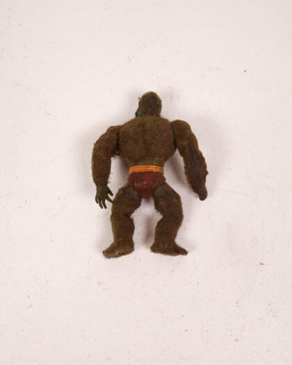 Vintage Masters of the Universe (MOTU) Moss Man action figure. Covered in flocked fur. Shows signs of wear and age.
