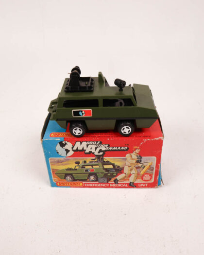 Vintage Matchbox Mobile Action Command Emergency Medical Unit toy car in original box. Minor wear, complete set. Box shows some damage, car in good condition.