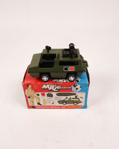 This is a vintage Matchbox Mobile Action Command (MAC) Emergency Medical Unit toy car, complete with its original box. The toy is from the 1970s or 1980s, featuring a green plastic body, black wheels, and a detailed interior. The MAC Emergency Medical Unit includes the vehicle itself, a stretcher, and various accessories.