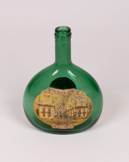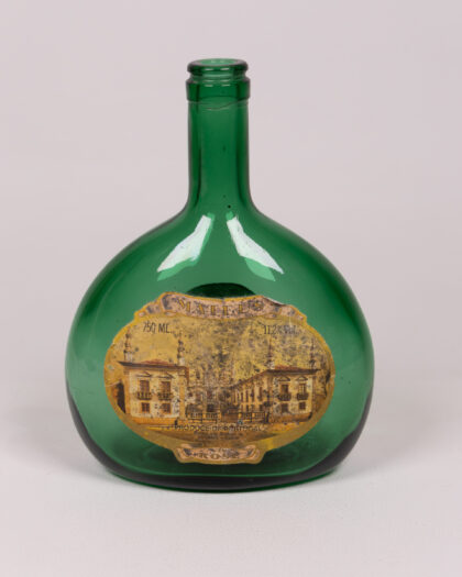 Vintage Mateus Rosé wine bottle in green glass. Features the distinctive round, squat shape. The label features an image of a building with the words 'Mateus' and 'Produce of Portugal.' On the reverse is a label for Edward Young & Co. of London. The bottle is empty and would make an excellent display piece.