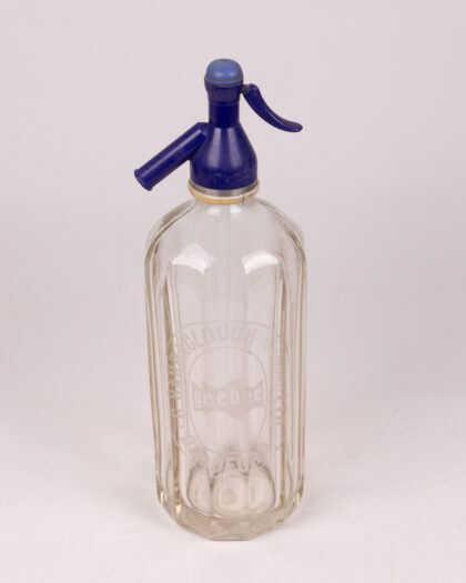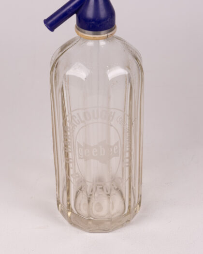 Vintage G Barraclough glass soda siphon with blue top and 'geebee' logo. Good condition, some wear consistent with age. Collectible barware.