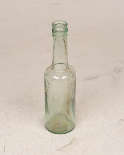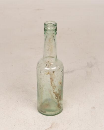 Vintage light green glass bottle with visible dirt and residue, perfect for decorative use or as a collectible item.