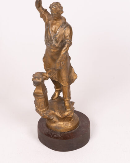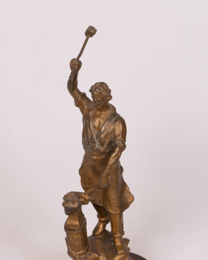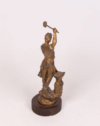 A vintage figurine depicting a blacksmith at work, poised to strike with his hammer. The sculpture is crafted from metal, possibly bronze, with a wooden base. The blacksmith stands next to his anvil, capturing a scene of craftsmanship. Ideal as a decorative piece for a study, workshop, or living room, this figurine adds a touch of historical artistry to any space. There are signs of wear adding to its vintage charm.