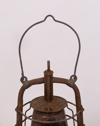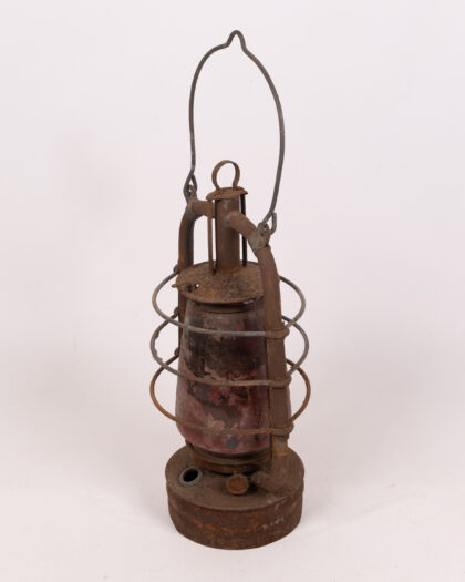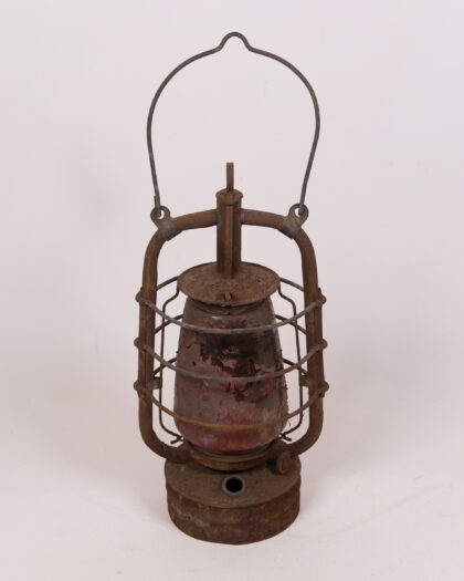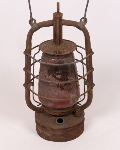 Vintage metal lantern with red glass globe, showing signs of age and rust. Decorative piece for a collector or rustic themed room.
