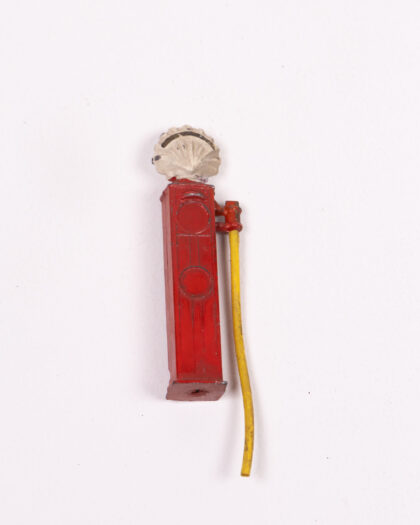 A vintage Shell metal petrol pump toy, perfect for a collector or as a quirky decorative item. Features a red metal pump body with the Shell logo at the top. The pump has a yellow hose and would suit a garage diorama. Shows signs of wear consistent with age, including paint loss and minor rust. Please refer to the images for a closer look at the condition.