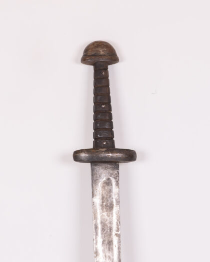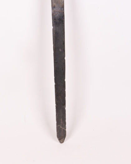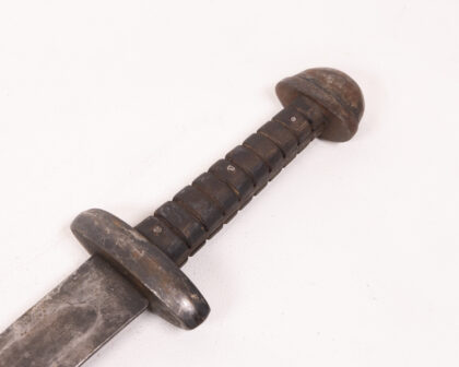 Vintage sword with darkened metal blade and wood handle. Decorative item suitable for historical weapon enthusiasts.