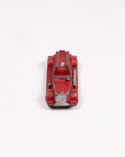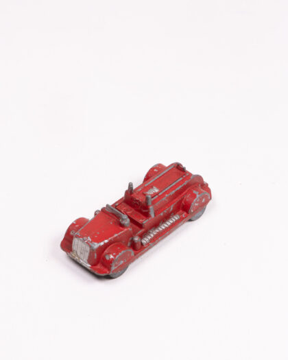 This is a vintage metal toy fire engine, painted in red with grey detailing. The toy shows significant wear and tear, with paint chipping and areas of discoloration, adding to its vintage charm. The fire engine has a classic design, reflective of mid-20th century toy manufacturing. Perfect for display, and collectors of vintage toys.