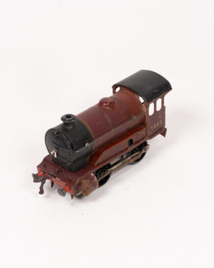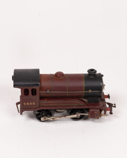 This is a vintage metal toy train locomotive, likely dating from the mid-20th century. It is primarily red and black with gold details and the number 5600 displayed on the side. The locomotive shows signs of age and use, with some paint chipping and wear on the metal, adding to its vintage charm. It's a delightful piece for collectors or as a decorative item.