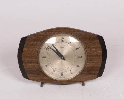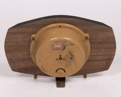 A vintage Metamec mantel clock featuring a circular face with Arabic numerals housed in a wooden case with dark side accents. The clock has a brass bezel and rests on small brass feet. The face shows some signs of age. The back reveals the clockwork mechanism, stamped with "Metamec Made in England" and "30 Hour". It would be a decorative addition to any mantelpiece or shelf, bringing a touch of vintage charm to your home. Untested - please contact for more details.