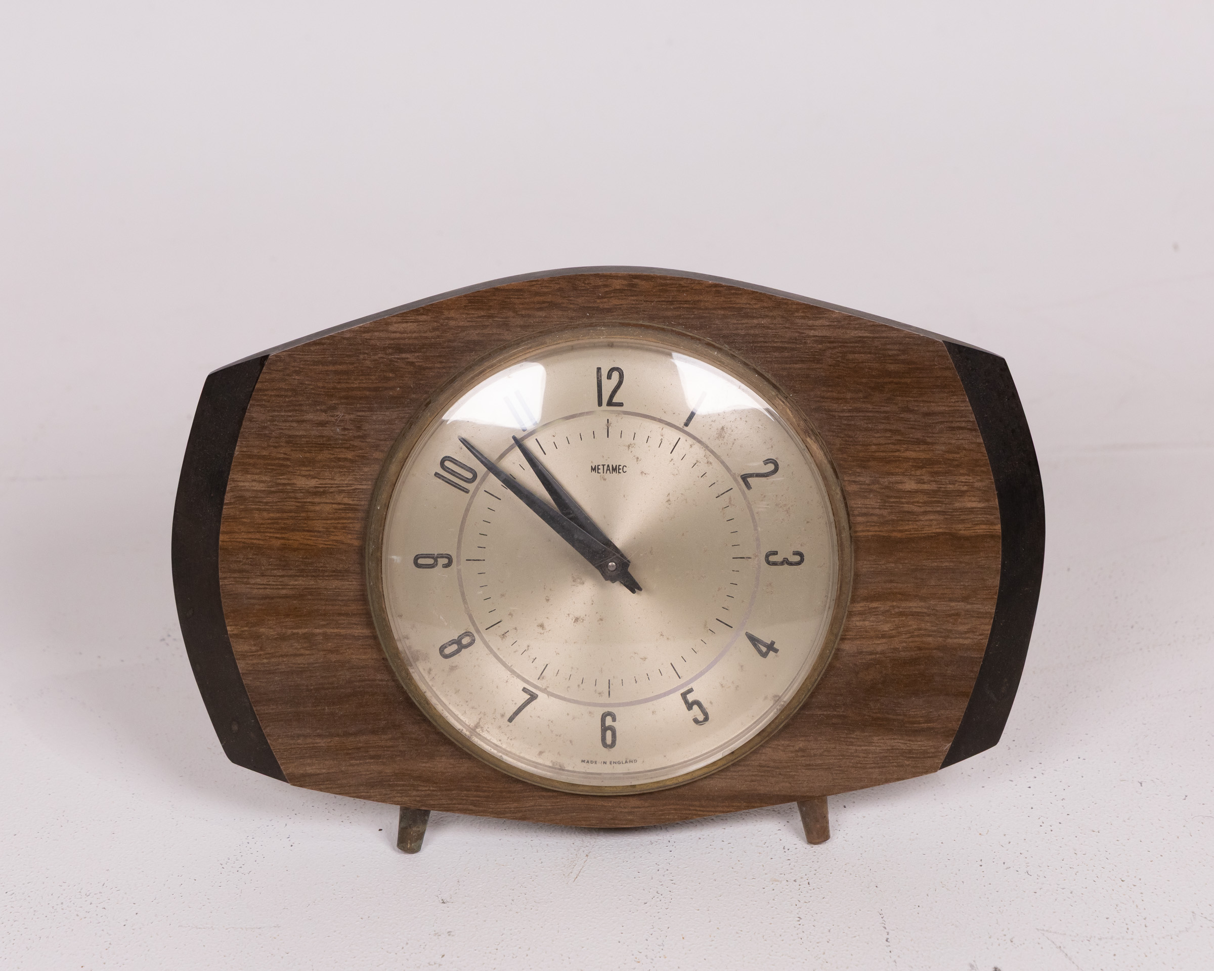 Vintage Metamec mantel clock with wood case, brass bezel, and metal hands. Shows signs of wear. ‘Made in England’. Wonderful vintage decor!
