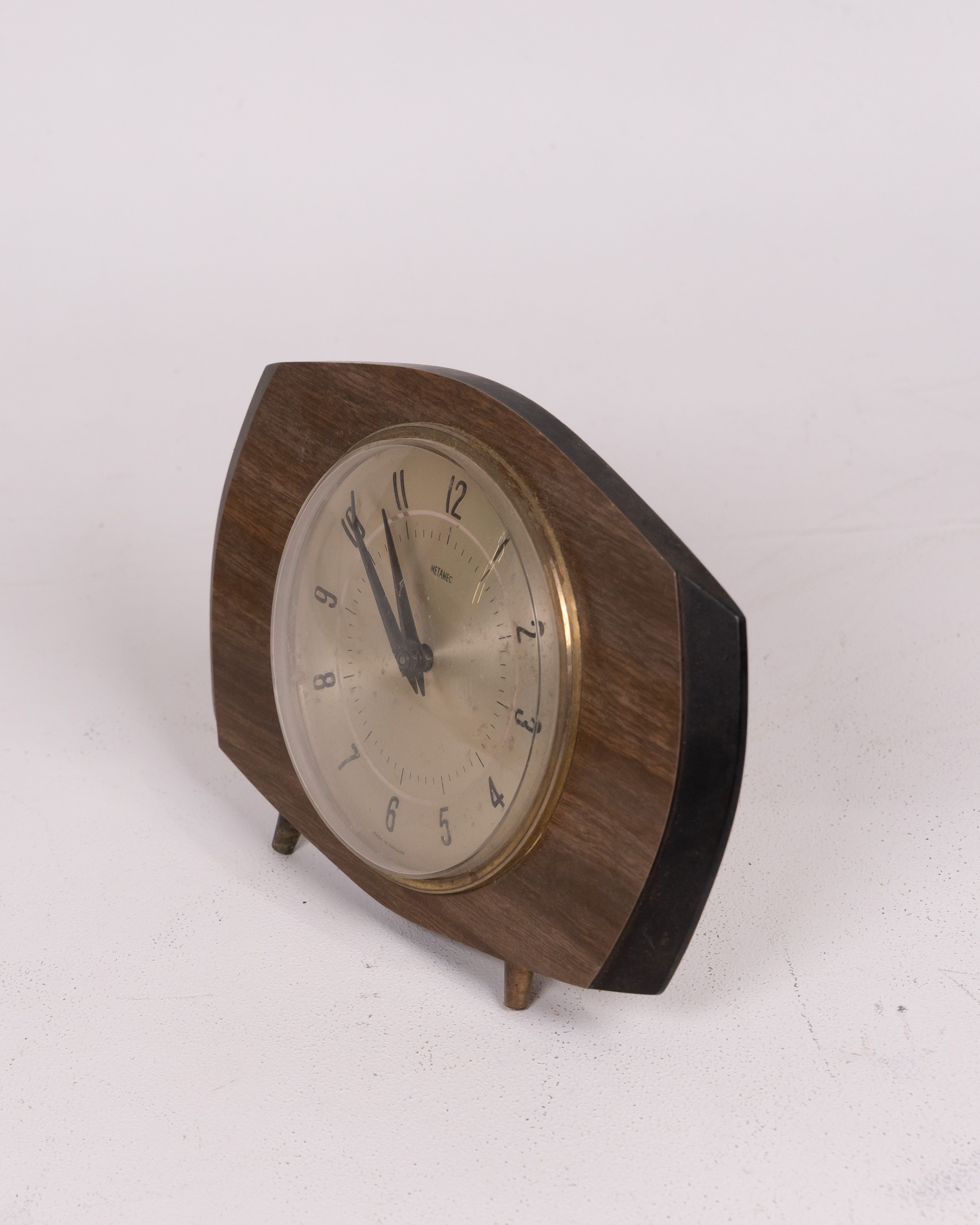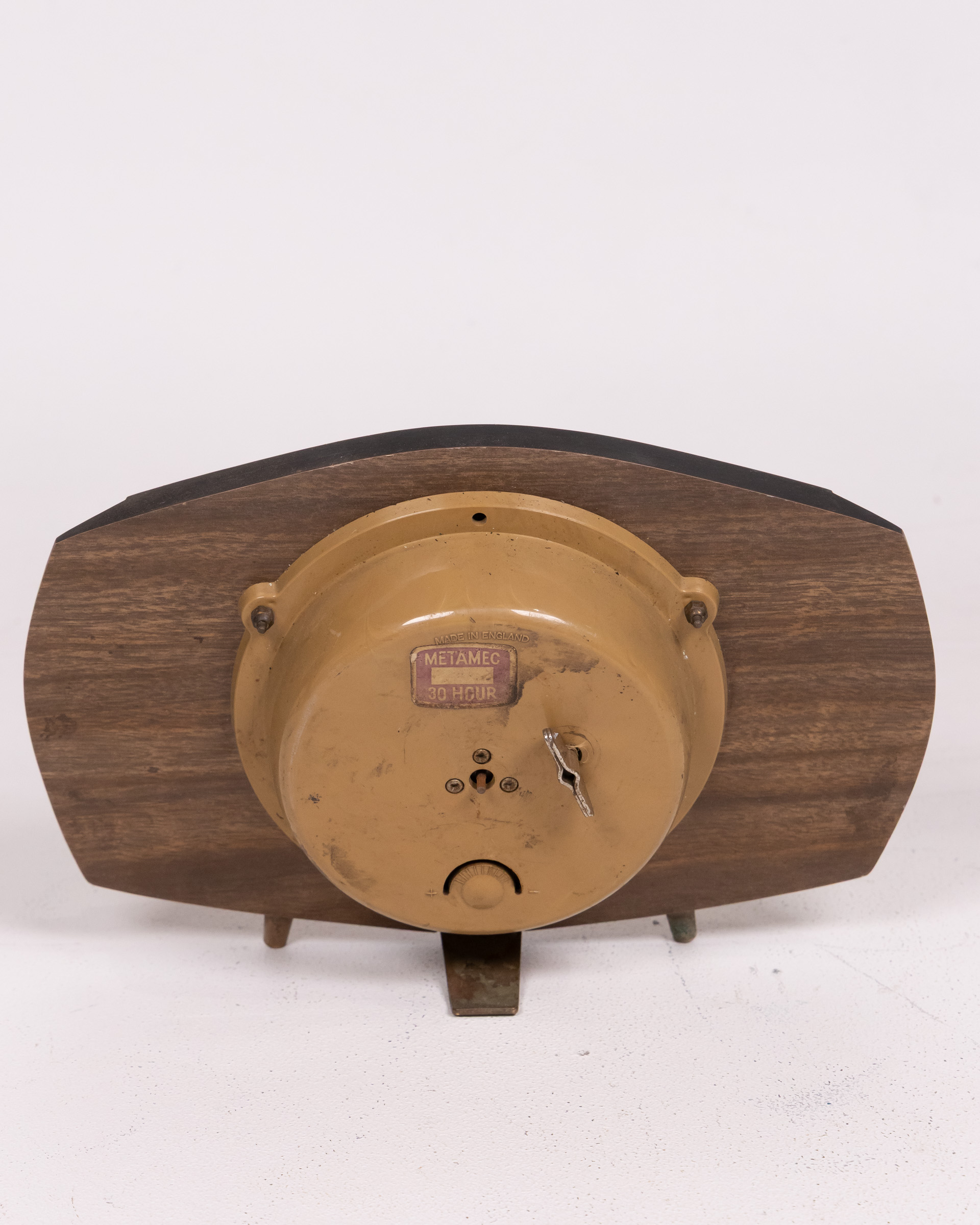 A vintage Metamec mantel clock featuring a circular face with Arabic numerals housed in a wooden case with dark side accents. The clock has a brass bezel and rests on small brass feet. The face shows some signs of age. The back reveals the clockwork mechanism, stamped with “Metamec Made in England” and “30 Hour”. It would be a decorative addition to any mantelpiece or shelf, bringing a touch of vintage charm to your home. Untested – please contact for more details.