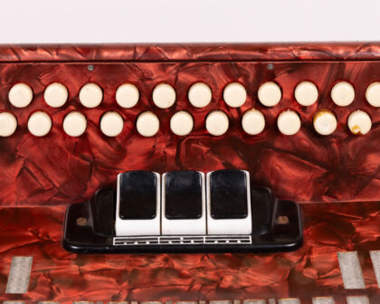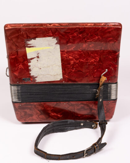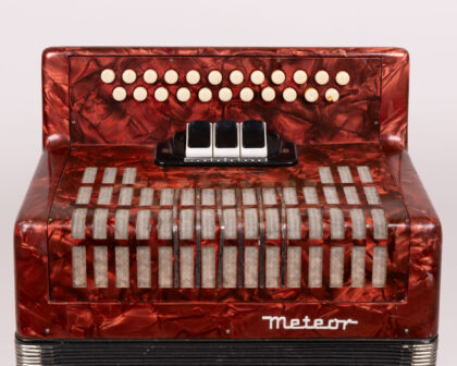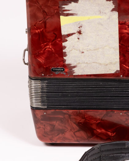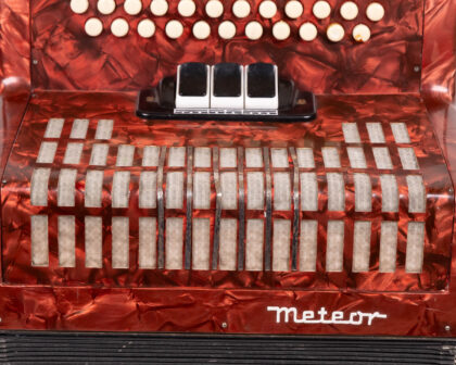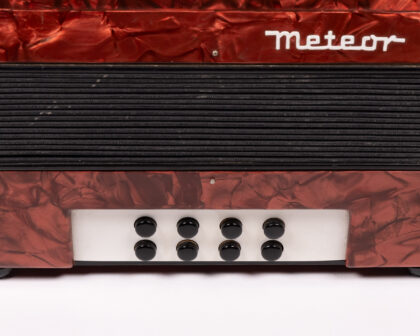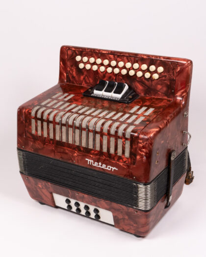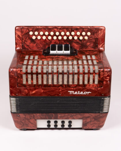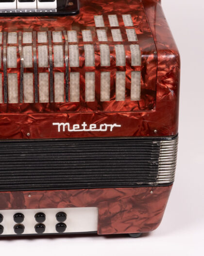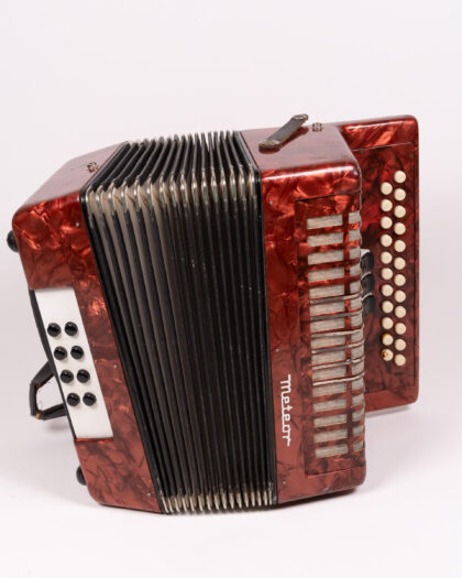 This is a vintage Meteor accordion. The colour is a distinctive marbled red. The bellows are black with bright chrome fittings. The straps appear to be made of leather. There are white buttons and black & white keys. It appears to be in good condition, but has not been tested. Ideal for a musician, or as an interesting display piece.