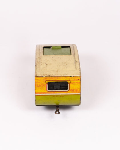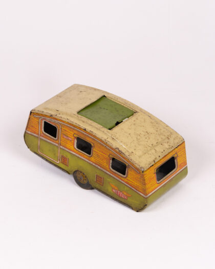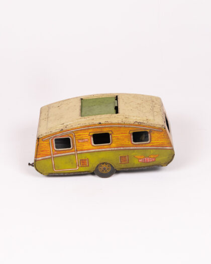 Vintage Mettoy Cosicot metal toy caravan. Shows signs of age, adding to its charm. A great collector's item.