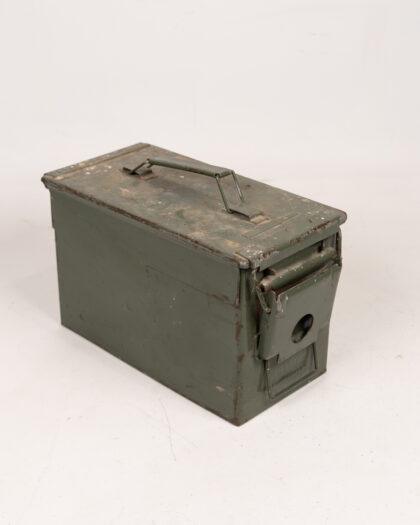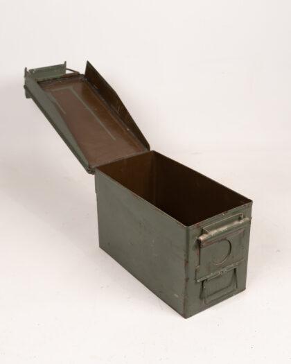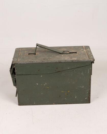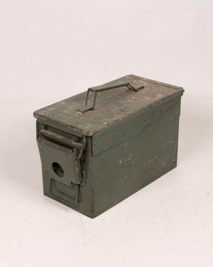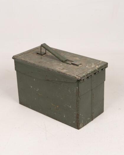A sturdy vintage military ammunition box, ideal for storage or display.