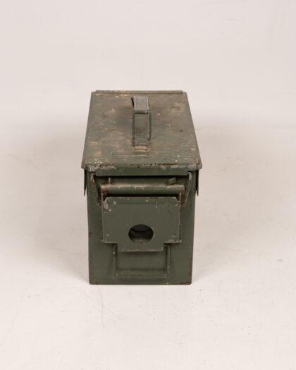 This vintage military ammunition box features a robust metal construction with a weathered green finish, indicative of its authentic use. It includes a secure latch mechanism and a top handle for easy transport. The box is perfect for collectors or as a unique storage solution for various items. Dimensions: approximately 30cm x 15cm x 20cm.