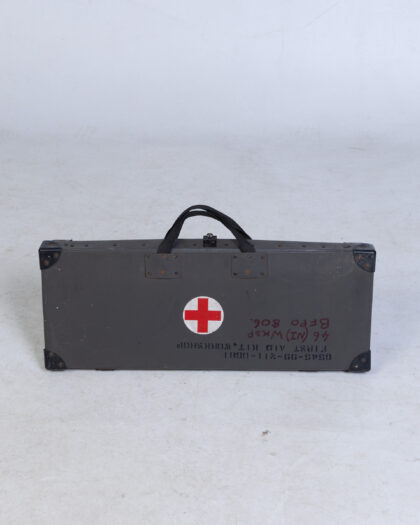 Vintage military first aid kit in grey box. Complete with supplies and marked with a red cross. Ideal for collectors or home use.
