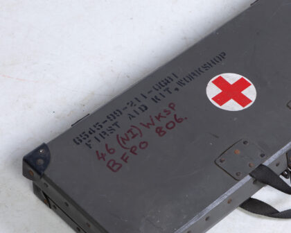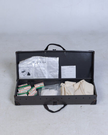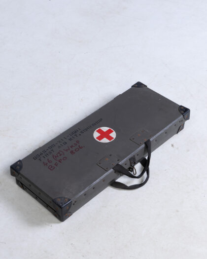 This is a vintage military first aid kit, likely dating back to the mid-20th century. The kit comes in a sturdy, grey box with reinforced corners and a black nylon handle. The box features a red cross symbol and military markings, indicating its use in a workshop setting. The kit is complete with various medical supplies, including bandages, gauzes, and instructions. Signs of wear and age consistent with use, including scratches, fading, and minor dents, add to its authenticity. Overall, this first aid kit is in good vintage condition, perfect for collectors, military enthusiasts, or as a unique storage solution for first aid essentials in a home or garage.