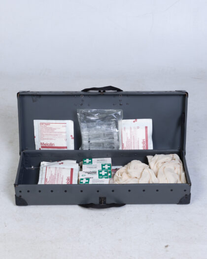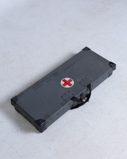 This is a vintage military first aid kit. It's a grey painted box with black reinforced corners and a carry handle on the top. It has a red and white cross on the front and writing (6545-99-211-0601 FIRST AID KIT WORKSHOP) on the front as well. The box has some general wear and tear but this adds to the vintage aesthetic. The box contains first aid equipment.