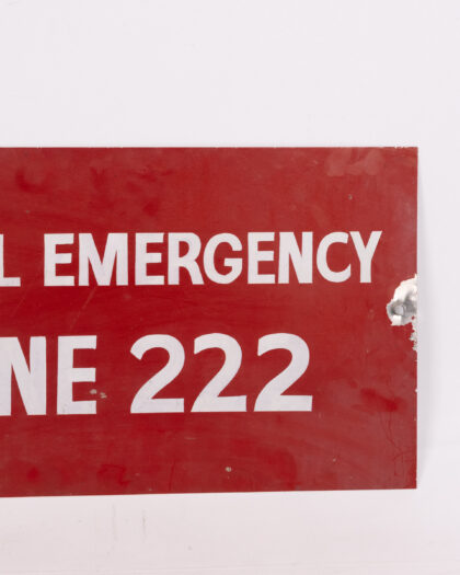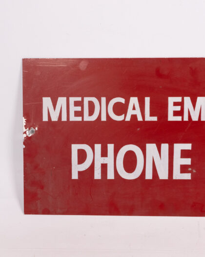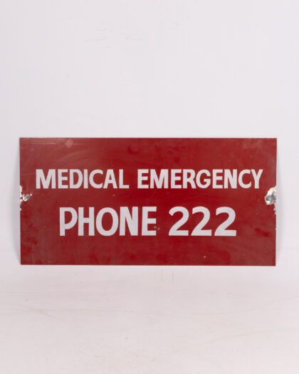 Vintage metal ‘ Military Medical Emergency Phone 222’ sign. Bold red and white lettering, distressed condition. Ideal for collectors. A unique decor item.