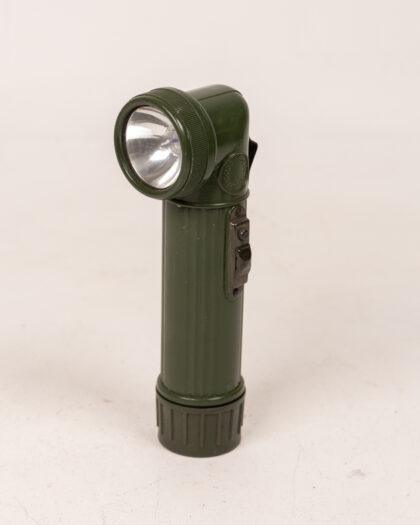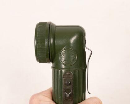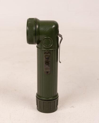 A vintage military-style flashlight with a green finish, featuring a right-angle design.