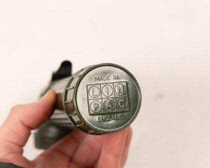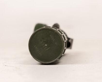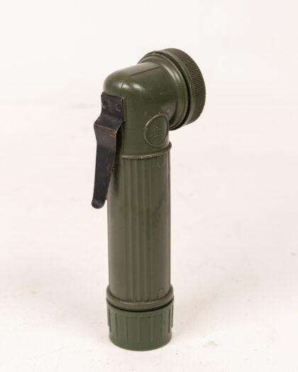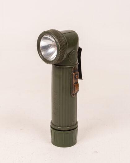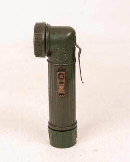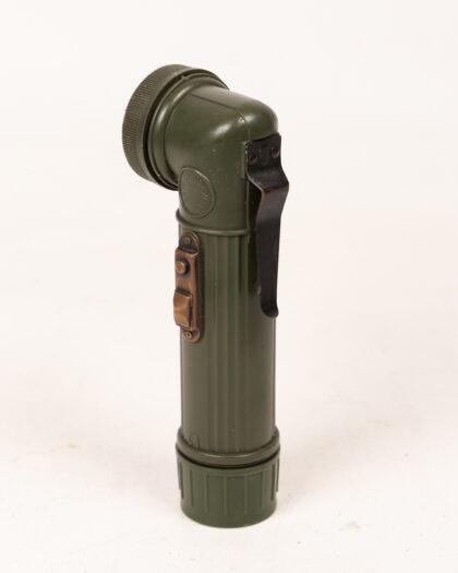 This vintage flashlight features a classic military-style design with a durable green body and a right-angle head. It is equipped with a sturdy clip for easy attachment and portability. The flashlight is in good condition, showing minimal signs of wear, making it a great collectible item or practical tool for outdoor adventures. Ideal for collectors of military memorabilia or those in need of a reliable light source.