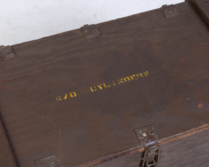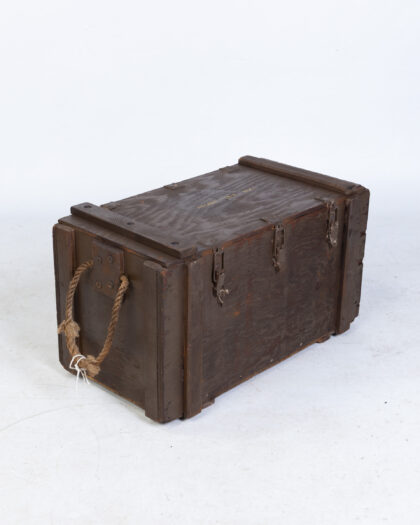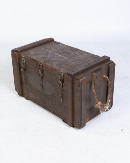 Vintage wooden military storage box. Restored and Revived by On The Square Emporium This rustic container shows signs of age with wear and staining on the wood, which adds to its authentic character. Features metal hardware and rope handles for easy transport. The stenciled text on the exterior adds to its military charm. Perfect for storage, display, or as a decorative piece.